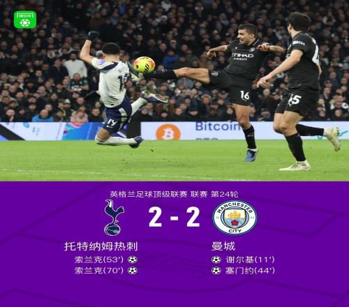 英超第24輪,熱刺主場(chǎng)2-2戰(zhàn)平曼城,此役上演梅開(kāi)二度的熱刺前鋒索蘭克當(dāng)選全場(chǎng)最佳球員。此役主場(chǎng)對(duì)陣曼城,首發(fā)...