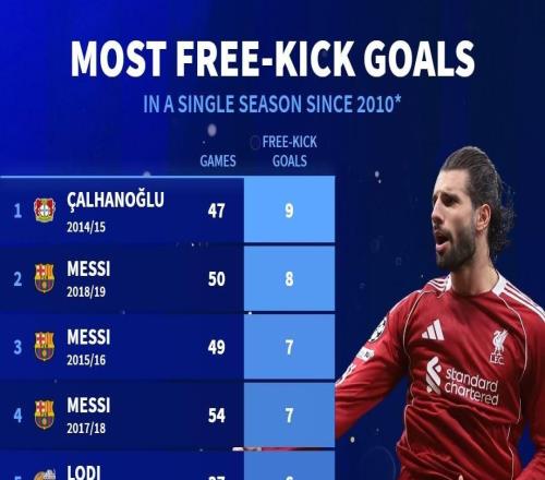 2010年以來(lái)單賽季任意球進(jìn)球榜:梅西三度上榜,索博4球第22