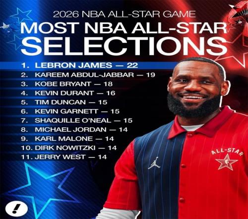 北京時間2月2日,NBA官方公布了全明星替補名單。統(tǒng)計顯示,詹姆斯今年入選后,以22次入選次數(shù)再度擴大領先優(yōu)勢。1...