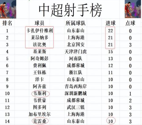 射手榜方面,卡扎伊什維利22球繼續領跑,法比奧昨晚無力破門,還是和萊昂納多差榜首1球并列第2。基萊斯15球排在第4,阿奇姆彭13球位列第5。克雷桑點射,韋斯利傳射建功,兩人追上澤卡,韋世豪等人10球剛好擠入前十。