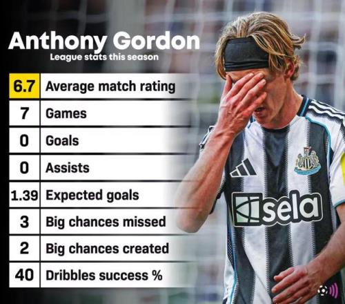 戈登在2023年冬窗從埃弗頓轉(zhuǎn)會(huì)至紐卡斯?fàn)枺跗诒憩F(xiàn)積極,給球隊(duì)帶來(lái)了速度和活力。然而,他的終結(jié)能力和決策力一直備受質(zhì)疑。本賽季他的進(jìn)球荒尤其刺眼,尤其是在球隊(duì)急需進(jìn)攻火力的時(shí)候。他在聯(lián)賽中缺乏直接貢獻(xiàn),使得紐卡斯?fàn)柕倪M(jìn)攻效率大打折扣。盡管他在歐冠中展現(xiàn)了不同的面貌,連續(xù)三場(chǎng)比賽都有進(jìn)球,但這反而加劇了外界對(duì)他在英超中“隱身”的質(zhì)疑。
