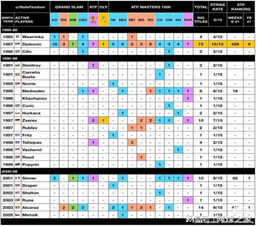 本賽季的大師賽已經結束,除了德雷珀、門希克、魯德、瓦舍羅和謝爾頓成為新大師外,其余四個冠軍均被阿爾卡拉斯和辛納瓜分。