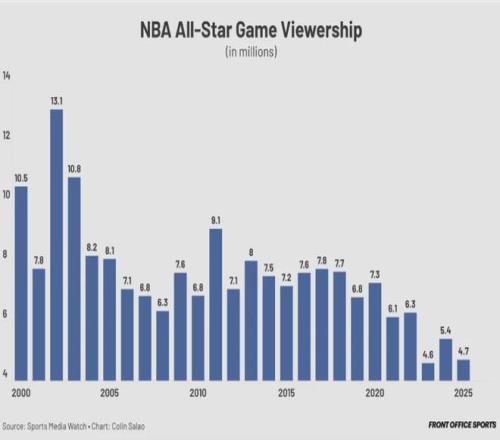 全明星為什么要改革?看看下面這張圖你就知道了。2025年NBA全明星正賽,在TNT的平均觀眾人數(shù)僅有470萬(wàn),比2024年下降13%。這是NBA史上收視率第二低的全明星,僅高于2023年的460萬(wàn)。跟20年前相比,差不多少了一倍。