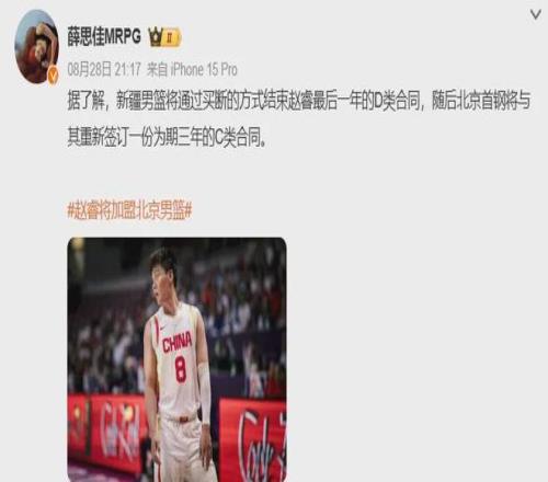 今年夏天,趙睿與新疆隊達成買斷協議,以三年C類合同把天賦帶到北京隊,迎來職業生涯第二次轉會。