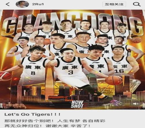 為廣東隊奪得今年全運會金牌之后,趙睿更新個人社媒,寫道:“Let's Go Tigers,那就好好告個別吧,人生有夢,各自精彩,再無眾神歸位,謝謝大家,辛苦了。”