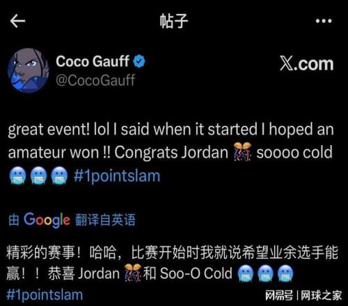 賽后,高芙還在社交媒體上連發(fā)兩條一球制勝的博文打趣自己的表現(xiàn),“既然辛納和蒂亞福都是發(fā)球失誤出局,那我感覺好受多了!”在賽事落幕后,她又發(fā)文表示,“精彩的賽事!一開始我就說,我希望業(yè)余球員奪冠!恭喜喬丹,太酷了!”