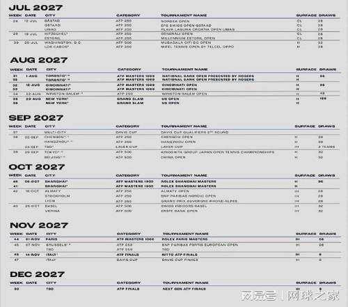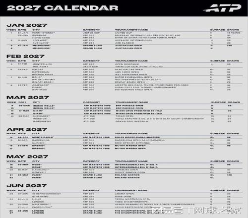 我們?cè)賮黻P(guān)注其它消息。北京時(shí)間今晨,ATP公布了2027賽季巡回賽的賽歷。2027賽季,ATP巡回賽將覆蓋全球29個(gè)國(guó)家和地區(qū),共舉辦59項(xiàng)賽事,另加四項(xiàng)大滿貫賽事,其中有7站大師賽將采用升級(jí)后的12天賽制。具體請(qǐng)看附圖。
