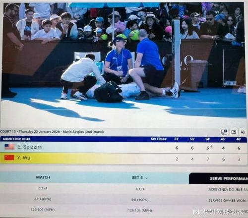 與此同時,在一場男子單打比賽中,中國選手吳易昺與斯皮澤里上演了五盤大戰。在連續輸掉前兩盤后,吳易昺頑強反擊,通過搶七贏下第三盤,又以6-4拿下第四盤,將比賽拖入決勝盤。決勝盤戰至2-3,吳易昺的發球局40-40平分關鍵時刻,一個Ace球落地時,他感到腰部不適——腰好像有點撐到了,隨后發出了雙誤。緊接著,他在落地時未能站穩,導致右腿開始抽筋,隨后左腿和腹肌也接連抽筋,最終以3-6輸掉決勝盤。