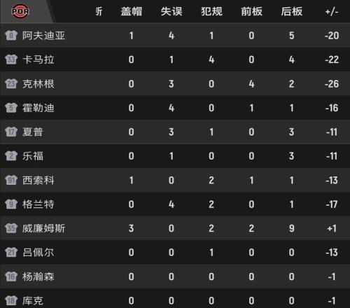 尼克斯隊本場7人得分上雙,其中布倫森砍下26分3次助攻,阿奴諾比24分6板3助,哈特20分6板5助,唐斯14分,外加20籃板3助攻。開拓者隊這邊夏普拿到26分,核心球員阿夫迪亞14投4中,僅得到11分。克林根出戰(zhàn)21分半鐘,只有7分6板的數(shù)據(jù),還出現(xiàn)了3次失誤,正負(fù)值負(fù)26,本場最低。