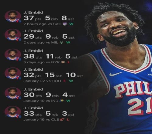 看看恩比德最近的數據,你就知道帕金斯為啥要道歉了。過去6場比賽,恩比德有5場砍下30+!最近4場比賽,恩比德場均34分10籃板7助攻,投籃命中率55%,三分命中率43%。最近6場比賽,恩比德場均33.2分9籃板5.8助攻!