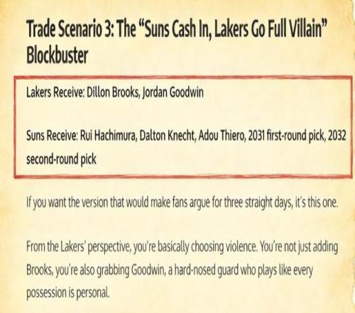 美媒《Fadeaway World》更是直接給湖人提出了一套交易方案,建議他們將克內克特、蒂耶羅、八村壘、2031年的首輪簽以及2032年的次輪簽送到菲尼克斯,換回狄龍和古德溫