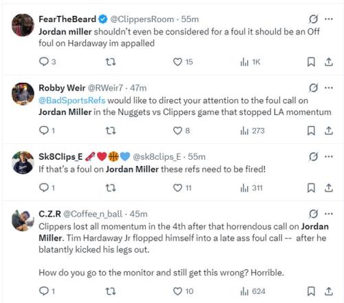 很多的快船球迷也開始吐槽裁判:1.請裁判注意一下,你們吹罰米勒對小哈犯規那球絕對是個誤判,那個球破壞了快船的勢頭;