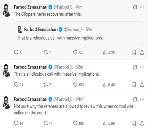 裁判在沒有哨子的情況下主動看回放給哨引發了快船記者Farbod Esnaashari的不滿,他表示:我完全不明白裁判在沒有響哨的情況下看回放是什么意思,這明顯是一個違規的行為,那是一個黃滅的決定,而且影響是極其深遠的。