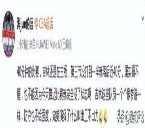 媒體人“海jun的藍”發文點評:40分鐘的比賽,吉林還是在主場,第三節沒打到一半就落后近40分,屬實看不懂,也不能因為今天推遲比賽就完全沒了狀態啊,吉林這些隊員一個個像夢游一樣,防守也不給強度,完美演繹了什么叫出工不出力。