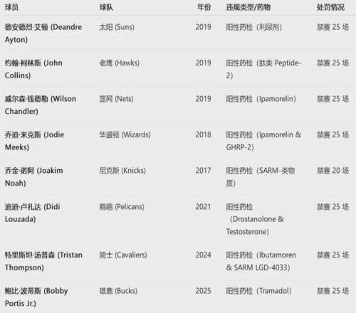 違反聯盟禁藥條例的處罰比較重,一般要禁賽20場以上。2025年2月21日,雄鹿內線波蒂斯被禁賽25場。再往前看,2024年1月24日,特里斯坦-湯普森被禁賽25場。光是2019年,艾頓、約翰-科林斯、威爾森-錢德勒等全被禁賽25場。