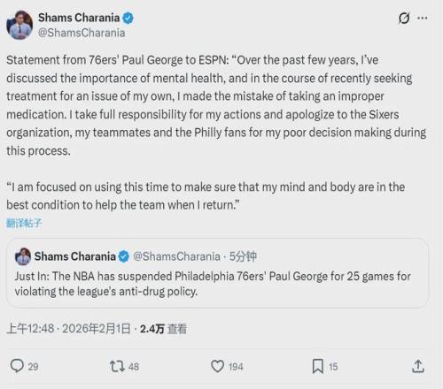 北京時間2月1日凌晨,一則突發消息,據NBA名記Shams報道,76人球星保羅-喬治因違反聯盟禁藥政策,被NBA禁賽25場。之后喬治通過ESPN發布道歉聲明,喬治表示,自己是為了治療心理健康,錯誤地服用了聯盟違規的藥物。