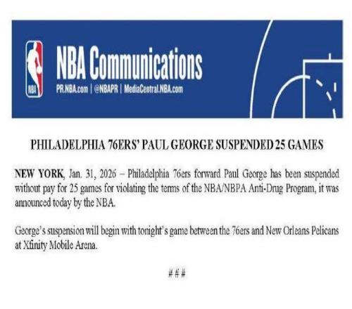 北京時間2月1日,NBA官宣重磅罰單,76人核心之一的喬治因違反聯盟禁藥政策,被禁賽25場比賽,他將直接損失1174萬美元薪水。喬治本人發布聲明向76人和球迷道歉,并且表示是尋求治療過程中“誤服不當藥物”。