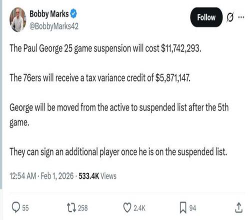 同時在喬治被禁賽第5場后,他將被轉移至禁賽名單,屆時,76人可以額外簽下一名球員填補空缺。
