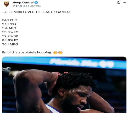 無懼喬治禁賽25場!恩比德狂轟40+11夢回巔峰率隊14戰10勝高歌猛進,超級探花也因禍得福獲得更多機會。