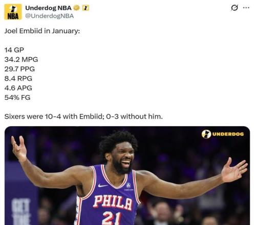 1月份恩比德在出戰的14場比賽中,場均轟下29.7分8.4板4.6助全能表現,命中率54%,率隊拿下10勝4負戰績,而在其缺席的3場比賽中,76人隊0勝3負。
