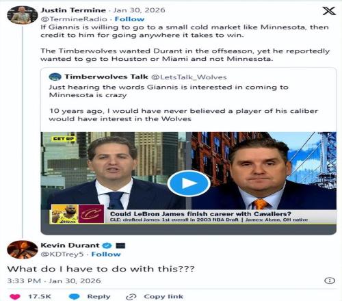隨后NBA記者Termine轉(zhuǎn)發(fā)該帖子,并配文道:“如果字母哥愿意去明尼蘇達(dá)這樣的小球市,那他為了奪冠愿意去任何地方的精神都值得稱贊。森林狼休賽期曾想要杜蘭特,但據(jù)說他只想去休斯頓或邁阿密,而不是明尼蘇達(dá)。”