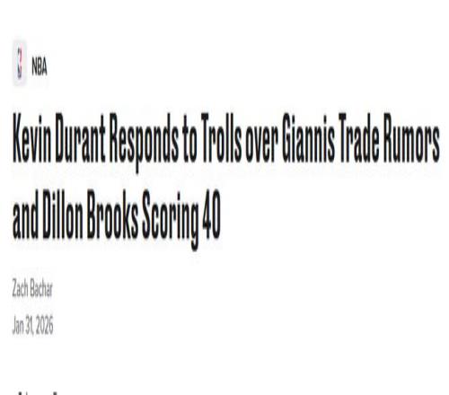 北京時(shí)間2月1日,鍵盤俠KD又上線了!火箭隊(duì)球星杜蘭特,對(duì)于自己的名字卷入字母哥與密爾沃基雄鹿隊(duì)的交易流言一事,頗感意外。此外,他還回應(yīng)了狄龍近日40分爆發(fā)。