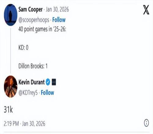 作為交易杜蘭特的籌碼之一,狄龍本賽季的表現(xiàn)非常出色,近日單場(chǎng)轟下40分,創(chuàng)生涯新高。有球迷指出,效力太陽隊(duì)期間,狄龍的40+得分場(chǎng)次是1場(chǎng),比杜蘭特(0場(chǎng))還多,杜蘭特則回復(fù)道:“31K”,顯然是以自己生涯累計(jì)31736分的成就予以回應(yīng)。