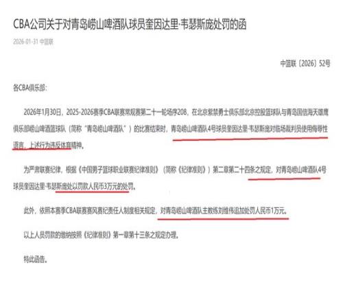 在賽后,CBA公司也是針對此事進(jìn)行了調(diào)查,最終,認(rèn)定青島隊(duì)外援奎因達(dá)里·韋瑟斯龐,在賽后,對當(dāng)值裁判員使用侮辱性語言,這樣的行為,嚴(yán)重違反了體育精神。