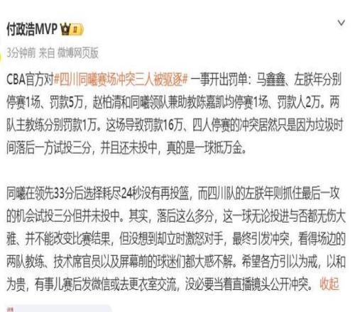 沒想到,一場普普通通的常規賽,雙方球員居然會在比賽最后垃圾時間階段爆發大規模沖突,領先一方的球員因為不滿落后方球員最后一投出手而爆發沖突,繼而大打出手,分別領到奪權被驅逐,上演了一出讓人無法理解的鬧劇,而更讓人沒想到的是,這次沖突賽后的代價竟然如此慘重,鬧事雙方分別吃到了CBA今天早上開出的重磅禁賽+罰款處罰。