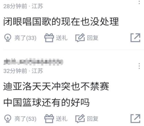 另一部分球迷則對CBA表達了不滿,分別拿了迪亞洛和前段時間在奏唱國歌儀式中沒有行注目禮的徐遠征來說事:迪亞洛天天沖突也不禁賽,中國籃球還有的好嗎?閉眼唱國歌的現在也沒有處理!