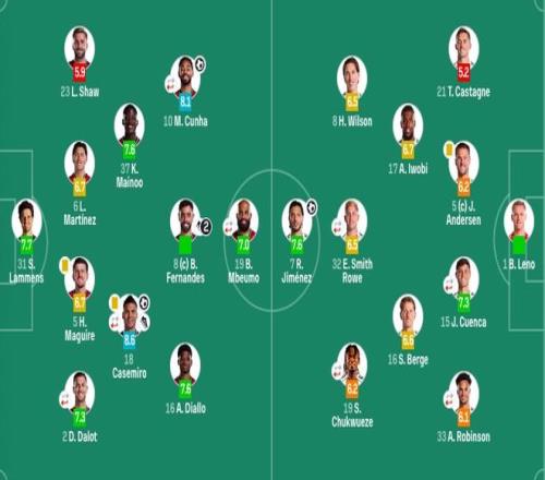 富勒姆首發:1-萊諾、21-卡斯塔涅、5-約阿希姆·安諾森、15-昆卡(86'3-巴錫)、33-羅賓遜(71'30-塞塞尼翁)、16-博格、17-伊沃比、8-哈里-威爾遜、32-史密斯-羅(71'22-凱文)、19-丘庫埃澤(79'10-凱爾尼)、7-希門尼斯