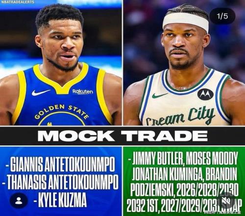 具體交易內容為:勇士得到字母哥+字母哥哥+凱爾庫茲馬,雄鹿則得到吉米巴特勒+摩西穆迪+喬納森庫明加+布蘭丁波杰姆斯基+2026年、2028、2030、2032首輪簽+2027、2029、2031首輪互換權。