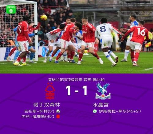 北京時間2月1日英格蘭足球頂級聯賽第24輪,諾丁漢森林主場對陣水晶宮。諾丁漢森林吉布斯-懷特破門,補時階段內科-威廉斯上演門線“撲救”被直紅罰下,隨后伊斯梅拉-薩爾點球破門。最終比分諾丁漢森林 1-1 水晶宮。
