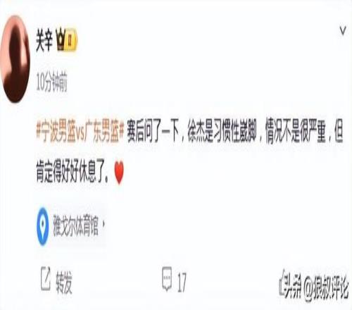 不久前,廣東體育頻道記者關辛發文報道,徐杰是習慣性崴腳,情況不是很嚴重,但肯定得好好休息了。