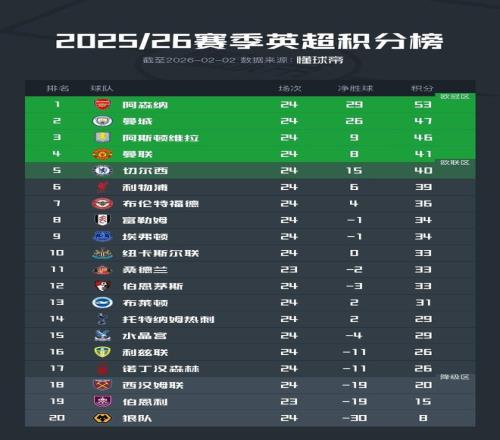 北京時間2月2日,2025/26賽季英超聯賽結束了第24輪的絕大部分比賽,積分榜的形勢也產生了進一步的變化。