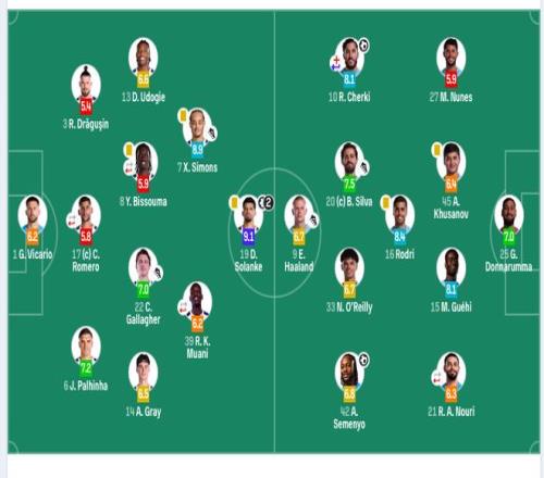 曼城首發:25-多納魯馬、27-努內斯、45-胡桑諾夫、15-格伊、21-艾特-努里(68’14-尼科·岡薩雷斯)、16-羅德里、20-B席(88’47-福登)、33-奧賴利、42-塞梅尼奧、10-謝爾基(68’4-賴因德斯)、9-哈蘭德。