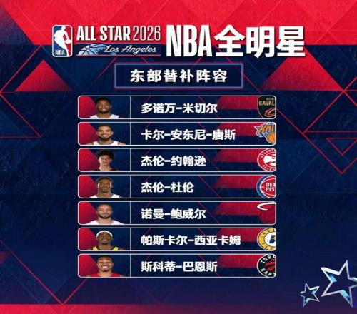 東部替補是米切爾(騎士)、杰倫·約翰遜(老鷹)、唐斯(尼克斯)、西亞卡姆(步行者)、鮑威爾(熱火)、巴恩斯(猛龍)、杜倫(活塞)。首發(fā)是布倫森(尼克斯)、字母哥(雄鹿)、馬克西(76人)、坎寧安(活塞)、杰倫·布朗(凱爾特人)。