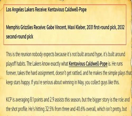 美媒《Fadeaway World》便提出了這樣一筆“小修小補”式的交易方案,他們建議湖人送出文森特、克萊伯、2031年的首輪簽以及2032年的次輪簽,從灰熊引入后衛波普。