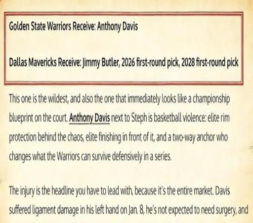 美媒《Fadeaway World》撰文建議,如果得不到字母哥,勇士可以轉(zhuǎn)而追求獨行俠前鋒戴維斯,并且他們給出了一套交易方案——