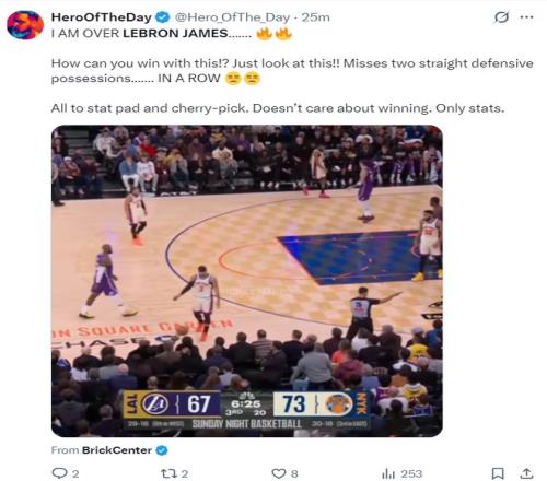 著名詹黑媒體賽后吐槽勒布朗的防守(正好就是湖人第三節(jié)崩盤的開(kāi)始):我對(duì)勒布朗-詹姆斯已經(jīng)厭倦了,他這樣打球怎么可能贏?看看這個(gè)瞬間吧,連續(xù)兩個(gè)防守回合都漏人,他只顧著刷數(shù)據(jù)、挑有利數(shù)據(jù)的位置,他根本不在乎輸贏,只在乎數(shù)據(jù)。