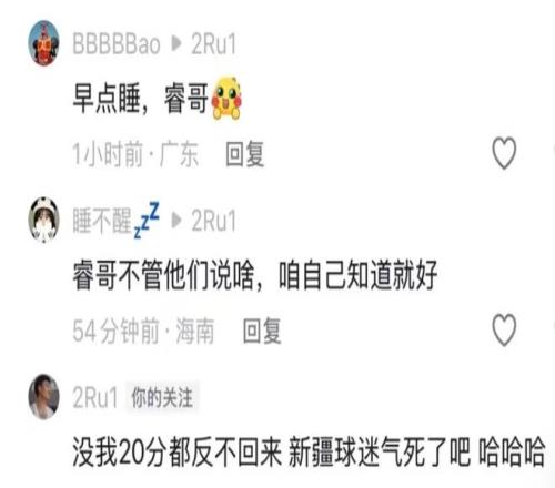 此外還有一條:沒我20分都反不回來新疆球迷氣死了吧哈哈哈。畢竟在球隊大部分落后的時候,就是靠著趙睿在進攻端的串聯扳回比分,這是大家都看在眼里的。也希望這次之后趙睿少被球迷的言論影響吧,確實有點敗好感。
