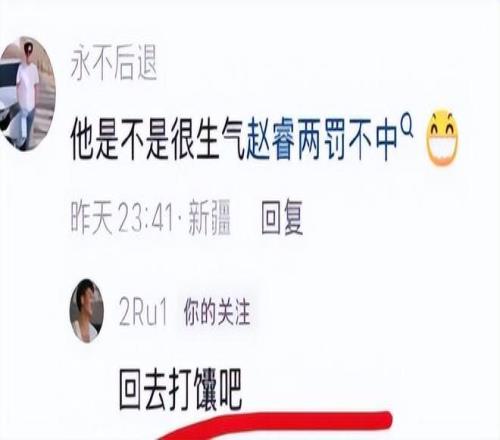 當然除了這條之外,趙睿還出現了其他回復。就比如趙睿兩次罰球沒有打進,趙睿直接回懟:回去打馕吧。因為那兩個球如果趙睿打進的話,球隊就可以追平了。可惜的是,趙睿卻錯失了。趙睿肯定也非常懊惱,所以在情緒不當的情況下,他也回懟了過去。