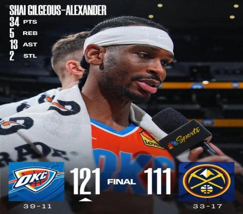 常規(guī)賽,雷霆客場121-111戰(zhàn)勝掘金。