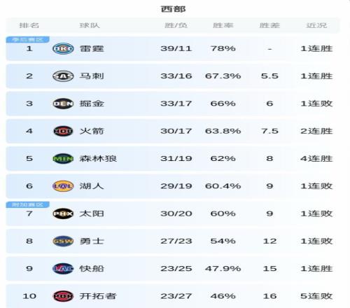 具體的西部排名:雷霆、馬刺、掘金、火箭、森林狼、湖人、太陽、勇士、快船、開拓者、獨行俠、灰熊、爵士、鵜鶘、國王。