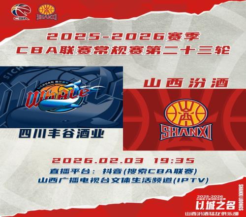 北京時間2026年2月3日19:35,2025-2026賽季CBA聯賽常規賽第23輪繼續進行,山西汾酒客場挑戰四川豐谷酒業,球迷觀眾可以通過抖音(搜索CBA聯賽)、山西廣播電視臺文體生活頻道(IPTV)觀看比賽實況,與我們一同為山西汾酒男籃加油助威!