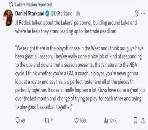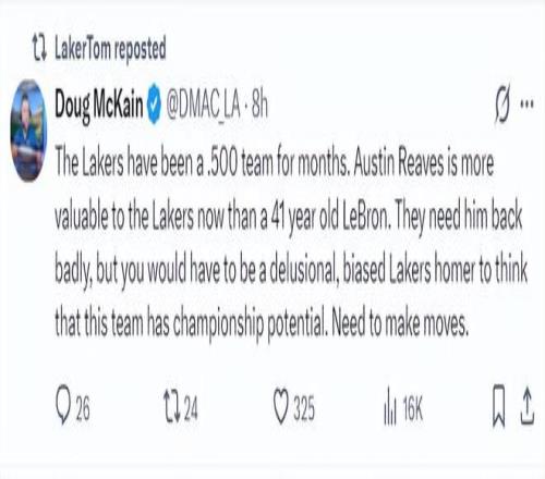 湖人記者Doug McKain賽后評(píng)論道:湖人已經(jīng)連續(xù)數(shù)月勝率在50%,奧斯汀-里夫斯對(duì)湖人而言的重要性遠(yuǎn)超過(guò)41歲的詹姆斯,湖人迫切希望里夫斯回歸,但你是個(gè)狂熱的湖人球迷認(rèn)為湖人一定要奪冠,那你一定是精神錯(cuò)亂或偏見了,因?yàn)檫@支球隊(duì)根本沒有奪冠實(shí)力,除非他們采取行動(dòng)。