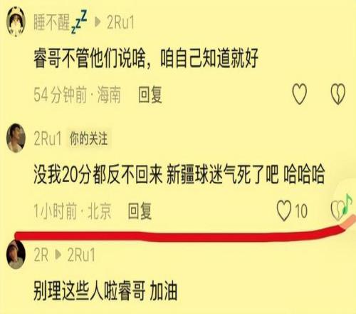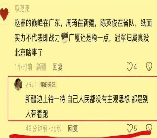而在對陣青島隊的這場比賽投籃10中4手感冷涼,并且在關鍵時刻兩罰盡失的北京首鋼隊后場絕對主力趙睿,輸?shù)舯荣惡蟮男那楸緛響摼筒惶茫援斔吹角皷|家新疆隊的球迷留言評論他現(xiàn)在所效力的北京首鋼隊本賽季的爭冠前景以及他的個人表現(xiàn)后火氣一下子就上來了,立馬怒懟了回去。