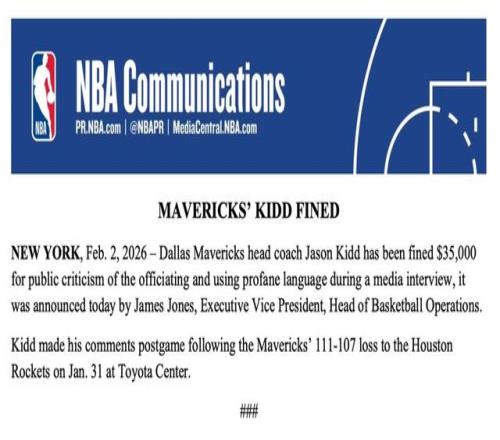 北京時(shí)間2月3日,NBA官方宣布,獨(dú)行俠隊(duì)主教練杰森-基德因在媒體采訪中公開批評(píng)裁判執(zhí)法并使用污言穢語,被處以35000美元罰款。