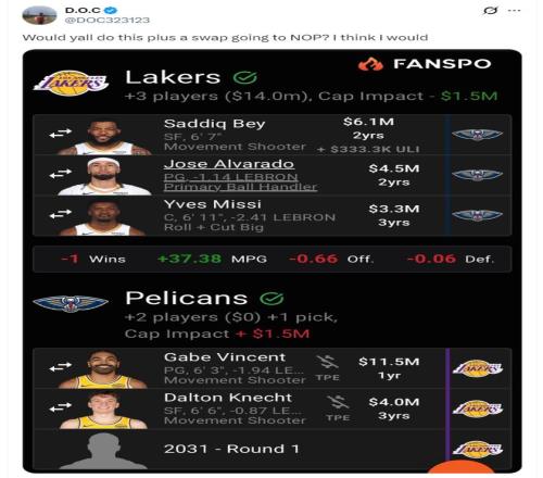 湖人媒體為佩林卡模擬了一套交易方案,湖人送出文森特、克內克特、2031年首輪簽,得到薩迪克-貝、阿爾瓦拉多、伊夫-米西,這筆交易是3換3,湖人原本是14+3名單,這筆交易后正好就是15+3名單。