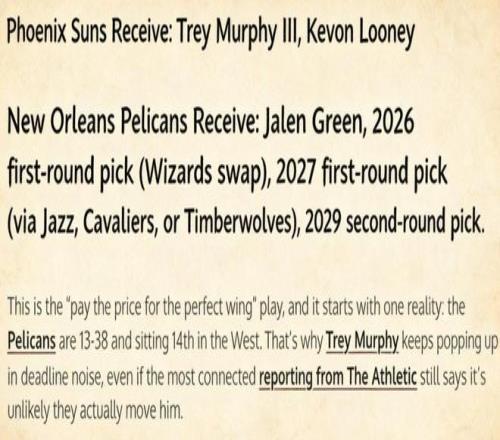 美媒《Fadeaway World》撰文提議,太陽應該打包杰倫·格林、2026年的首輪簽(奇才互換權)、2027年首輪簽(來自爵士、騎士或森林狼)以及2029年的次輪簽送到新奧爾良,換回鵜鶘前鋒墨菲。